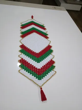 Lindo centro de mesa em crochê, perfeito para a época natalícia. Peça única, feita com cuidado e atenção aos detalhes. - Design em chevron com as cores tradicionais do Natal. - Acabamento com fio dourado. - Detalhe de tassel vermelho na ponta.