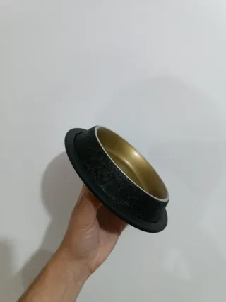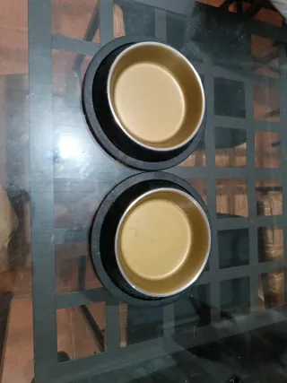Conjunto de duas tigelas para comida de gato. Vendo duas caçarolas para gatinhos, usadas poucas vezes e em muito bom estado, como Novas! Aço inoxidável, 250ml. - Tigelas em metal dourado. - Bases em borracha preta.