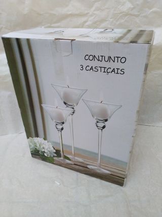 Castiçais em vidro e não inclui velas. Sem marcas de utilização