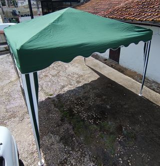 Toldo com estrutura em alumínio. Pano não está queimado do sol, tem alguns pontos de sujidade e um furo pequeno, tamanho de 0,01€ Saco em mau estado, com sujidade, resgado e com o fecho com defeito, devido a estar muito tempo guardado sem ser utilizado. O toldo foi utilizado apenas 5 dias.