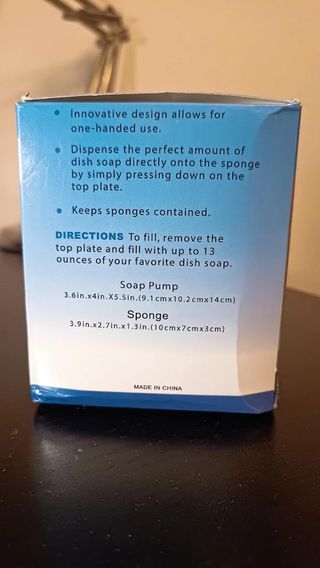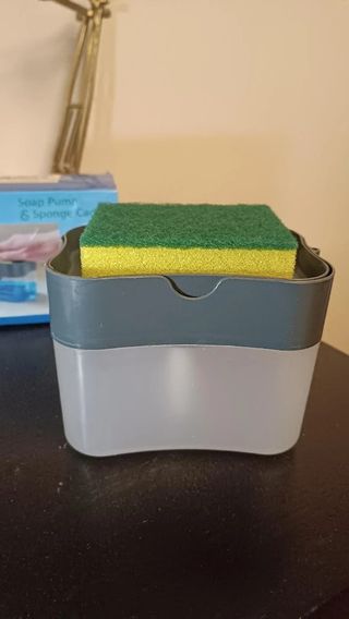 Dispensador de detergente para louça com suporte para esponja. Completamente novo. Inclui também um esfregão. Basta colocar detergente de louça e pressionar. Dimensões: 14x9x11cm