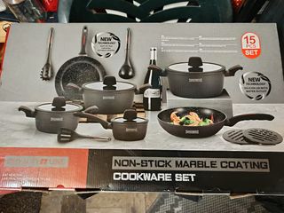 Conjunto de panelas Royalty Line, 15 peças, novo. Revestimento de mármore antiaderente. Ótimo estado. Inclui panelas, frigideira e utensílios de cozinha. Ideal para cozinhar de forma saudável e eficiente. - Revestimento antiaderente de mármore - 15 peças - Utensílios de cozinha incluídos - Adequado para todos os tipos de fogão, incluindo indução