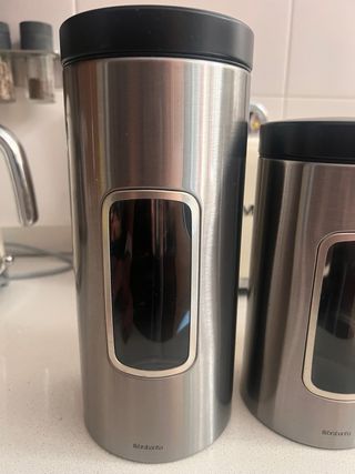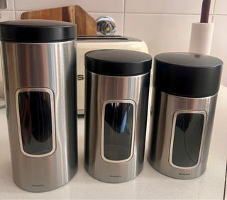 Conjunto de três frascos de armazenamento da Brabantia. - Frascos em metal com tampas pretas. - Design moderno com janela para visualização do conteúdo.