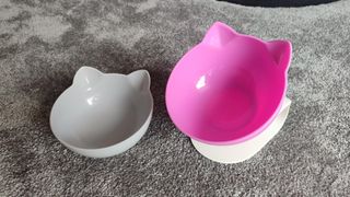 Comedouro e bebedouro para gatos: rosa e cinzento