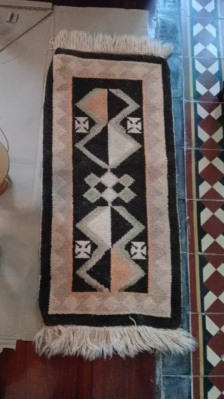 Tapete Kilim Dhurrie com um design geométrico único, tecido à mão. - Cores: bege e preto. - Material: tecido e lã.