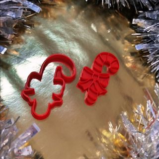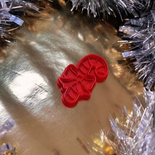 Cortador de bolacha/biscoito de Natal, na forma de bengala doce com um lacinho. Não deve ser lavado à máquina. Dimensões : 7cm X 4cm *** Christmas cookie cutter shaped as a christmas candy cane with a bow. Should be hand washed Size: 7cm X 4 cm