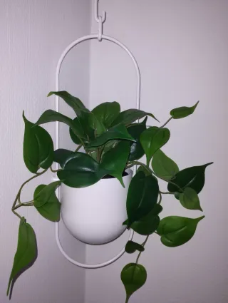 Este vaso traz um toque de verde para qualquer espaço. A planta artificial tem um aspeto muito realista. - Vaso suspenso branco com suporte de metal. - Folhagem verde vibrante.