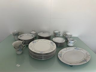 Serviço Lily em porcelana do ano 1984 composto por 41 peças no total sendo as mesmas: * 7 pratos de sopa * 7 pratos ladeiros * 8 pires * 1 terrina * 8 pires de chá * 1 açucareiro * 1 leiteiro * 8 chávenas de chá