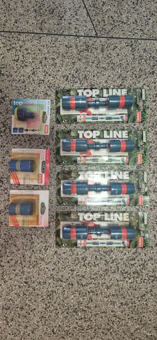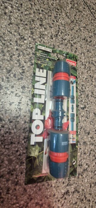 Conjunto de acessórios para mangueira de rega da marca Tatay, linha Top Line. Novos e embalados. - Inclui 4 conectores rápidos e 2 adaptadores universais. - Os conectores são de cor azul e vermelho. - Embalagens em bom estado.
