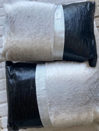 Conjunto de duas almofadas decorativas com um design moderno e elegante - Combinação de texturas em preto e cinzento - Detalhe de faixa central em tom prateado. - Acabamento em pele sintética e tecido macio.