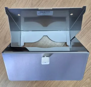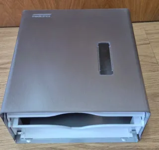Dispensador de papel da marca Mediclinics. - Acabamento em metal e plástico. - Cor cinza/prata.
