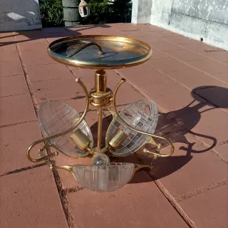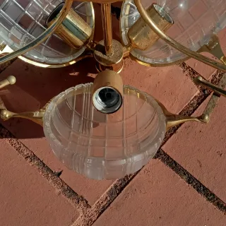 Candeeiro de sala de jantar com um design clássico e elegante. - Estrutura em metal com acabamento dourado e castanho. - Detalhes em vidro. - Ideal para criar um ambiente acolhedor.