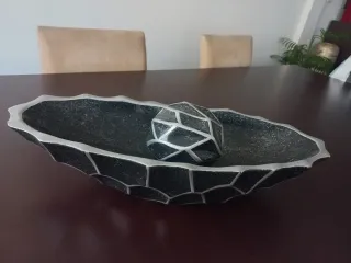 Peça decorativa para centro de mesa com um design moderno e elegante. - Acabamento em metal e pedra. - Combinação de cores preto e prateado.