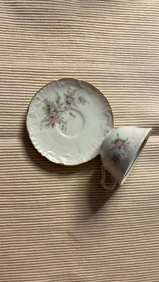 Serviço de café vintage composto por 6 chávenas e seis pratos, com flores muito suaves. Na base das chávenas tem o símbolo EMA, nos pratos não.