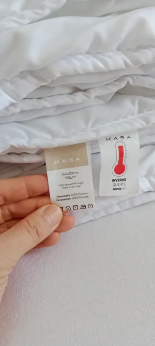 Edredão de inverno em poliéster, cor branca, com medidas de 160x200cm. Ideal para noites frias. - Acolchoado com costuras quadradas. - Acabamento com debrum nas bordas.