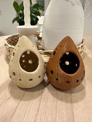 Vendo cachepot de pendurar para pequenas plantas ou para colocar velas decorativas. Disponível em tamanhos personalizáveis e nas cores castanho, branco ou beje. Preços: até 12cm x 10cm - 5 euros até 16cm x 14cm - 8 euros Envio por Wallapop.