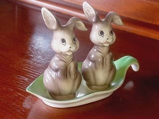 Saleiro e pimenteiro em cerâmica em forma de coelhos sobre uma folha Em cerâmica vidrada. Saleiro e pimenteiro: 12cm de altura Base (folha verde): 18 x 8cm Em excelente estado, nunca usados