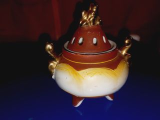 Queimador Satsuma Moriage, que é um tipo de cerâmica japonesa. A cerâmica Satsuma é conhecida pelo seu esmalte rachado e decorações elaboradas com esmalte policromático e ouro. A técnica "moriage" refere-se à decoração em relevo adicionada à cerâmica, criando um efeito tridimensional. Este estilo de cerâmica surgiu no final do século XVI e tornou-se popular como artigo de exportação para a Europa após a Exposição Internacional de Paris em 1867. Esta foi adquirida em 1990's. Tem cera de 9 cm de altura.