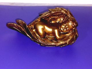 Em resina com acabamento em tom dourado dando um aspeto clássico e espiritual. Design: A estatueta retrata um bebé anjo deitado de lado, a dormir pacificamente sobre as suas próprias asas grandes e detalhadas, que o envolvem como um ninho ou cama. Artigo popular como símbolo de proteção e inocência. Adquirido nos anos 2000. Cerca de 12 x 7 cm