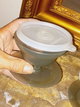 Artigo dos anos 90. Conjunto giríssimo e prático de taças para sobremesa. Em plástico de alta qualidade e resistente, da Tupperware. Cada taça é constituída por 3 peças que se desmontam: prato, taça e a tampa. Com cerca de 8,0cm de altura e 9,5cm de diametro.