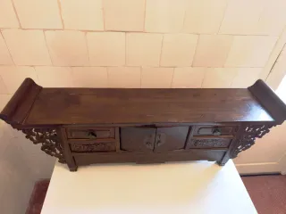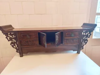 Vendo pieza de madera antigua estilo oriental, ideal como consola, aparador bajo, mueble auxiliar o altar decorativo. ✨ Mueble de gran presencia y estilo, con talla decorativa, herrajes metálicos y múltiples compartimentos: 2 cajones laterales 2 puertas centrales con espacio interior de almacenamiento ✅ Material: madera maciza ✅ Estilo: oriental / vintage ✅ Medidas: 92 x 19 x 32 cm ✅ Estado: perfectamente conservado (ver fotos) ✅ Ideal para decoración en salón, entrada, dormitorio, casa rural, tienda, hotel o ambiente zen. 📍 Entrega en mano en Tavira o provincia de Huelva (pieza delicada y pesada). Se puede ver sin compromiso.