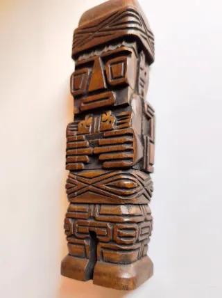 Vendo figura/tótem decorativo de madera maciza, tallada con estilo precolombino (inspiración azteca/maya). Pieza muy original y llamativa, ideal para decoración étnica, rústica o boho. 📌 Detalles: Material: madera tallada Medidas: 25 cm alto x 7 cm ancho aprox. Buen estado (ver fotos) Perfecta para salón, despacho, estantería o colección.