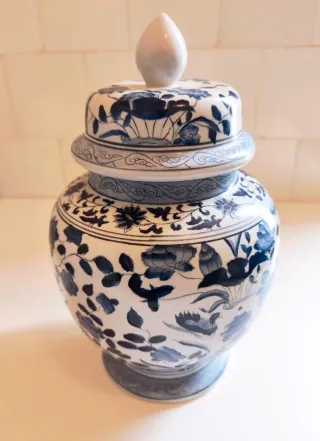 Vendo precioso jarrón decorativo de porcelana estilo oriental, en blanco y azul con motivos florales. Incluye tapa original con pomo. Ideal para decoración de salón, recibidor o estantería. 📏 Medidas: 34 cm de alto x 20 cm de diámetro ✅ Muy decorativo y elegante ✅ Buen estado general