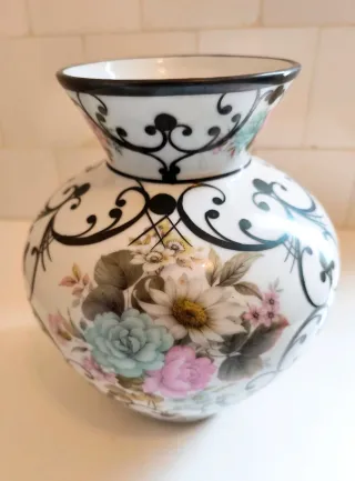 Vendo jarrón decorativo muy bonito y elegante, de estilo clásico/moderno, en tonos blancos con motivo floral (flores en pastel) y detalles ornamentales en negro, ideal para salón, entrada, dormitorio o despacho. ✨ Estado: muy bueno, sin golpes ni roturas. Perfecto para decoración con flores secas, ramas o simplemente como pieza decorativa. 📏 Medidas: 28 × 23 cm