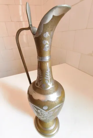 Vendo jarra decorativa de metal con asa alta y pico, con grabados y detalles florales (acabado envejecido en tonos dorados/plateados y detalle rojo). Ideal como pieza de decoración vintage, estilo árabe/oriental, perfecta para salón, estantería o recibidor. 📏 Medidas: 33 × 12 cm 🔩 Material: metal ✨ Estado: muy bueno
