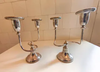 Pareja de candelabros vintage de metal plateado, de diseño elegante y clásico, ideales para decoración de salón, mesa de comedor, chimenea o eventos. Cantidad: 2 unidades (pareja) Medidas aprox.: 23 x 18 cm cada uno Material: metal plateado (marcados SERANCO S.P.C) Buen estado, como nuevos. Muy decorativos y con un acabado precioso. Se venden juntos (pareja).