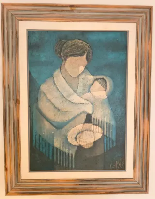 Cuadro decorativo grande (92 x 72 cm), escena de madre con bebé, en tonos azules, estilo moderno / naíf con textura. Incluye marco y paspartú, ideal para salón, dormitorio o entrada. Muy decorativo y con mucha presencia por tamaño. Estado bueno (signos normales del tiempo). Medidas: 92 x 72 cm