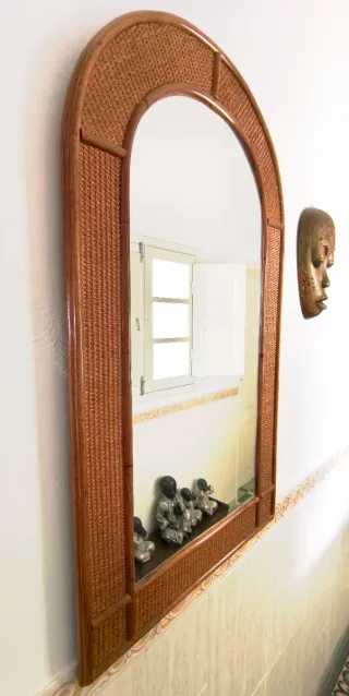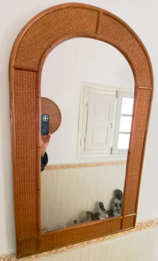 Vendo espejo grande de cristal con marco de caña trenzada (estilo mimbre/ratán), con forma arqueada en la parte superior. Ideal para entrada, salón, dormitorio o baño, decoración estilo boho, colonial, mediterráneo o rústico. 📌 Material: cristal + marco de caña trenzada 📌 Medidas: 101 x 61 cm 📌 Forma: arco superior 📌 Estado: bueno Entrega en mano o envío bien embalado. 💰 Negociable con responsabilidad