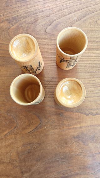 Conjunto de quatro copos feitos em bambu, com uma bela decoração de bambu pintada. - Material natural e sustentável. - Design único com pintura. - Perfeitos para um toque rústico. Alguns apresentam rachadelas da idade.