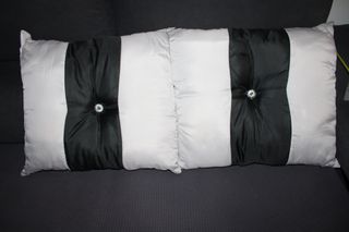 Conjunto de duas almofadas decorativas com um design moderno. - Listras verticais em cetim preto e cinza. - Detalhes com botões brilhantes no centro de cada faixa preta. Medidas: 53cm por 43cm.