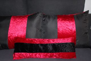 Conjunto de almofadas com um design moderno e vibrante. - Combinação de cores preta e vermelha. - Texturas em cetim e veludo para um toque luxuoso. Medidas: Quadradas- 53cm por 43cm Comprida- 57cm por 20cm