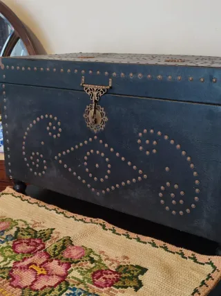Esta arca vintage apresenta um design clássico com detalhes que adicionam um toque de elegância. - Revestimento em napa preta. - Ferragens em metal dourado. - Padrão decorativo com tachas. - Fecho frontal ornamentado.