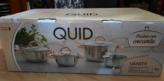 Trem de cozinha vanity Excelente distribuição do calor sem necessidade de potências elevadas. Composto por 3 Caçarolas com tampas ( 16cm, 20cm, 24cm) e 1 tacho (14cm). Compatível com todo o tipo de fogões, inciundo indução. Metal e aço inoxidável 201. Preço original 89,00€ Novo, dentro da caixa e embalado Oferta de 2 tachos em esmalte de cor vermelha (ver fotos)