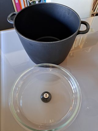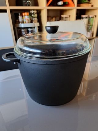 Panela preta Material: alumínio fundido Capacidade: 6 litros Estado: usada apenas 1 vez Com tampa de vidro