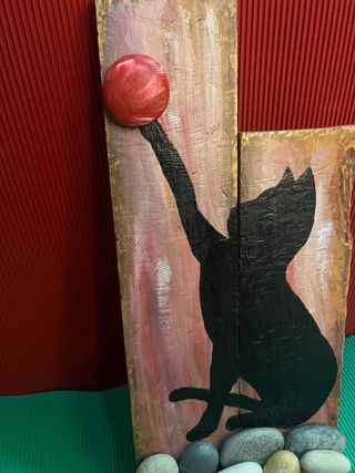 Peça decorativa artesanal com silhueta de gato a brincar com uma bola. - Base em madeira com pintura. - Detalhes em pedras naturais. - Elemento esférico em destaque.