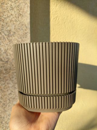 Vaso de lona. Feito a partir de lona reutilizada, e po risso as cores e padrões variam. Tem molas de metal para o manter montado. Adequado para vasos com até 12 cm de diâmetro.