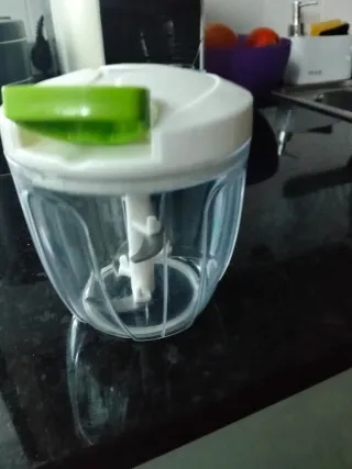 Cortador de legumes manual com design prático. - Lâminas afiadas para um corte eficiente. - Puxador ergonômico para facilitar o uso. - Recipiente transparente para visualizar o conteúdo.