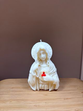Vela em formato de escultura do Sagrado Coração de Maria. Uma peça delicada e cheia de significado. - Detalhes esculpidos com cuidado. - Representação do Sagrado Coração.
