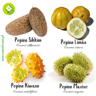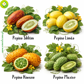 Pack/kit 4 Variedades Exóticas – Pepinos Kit compuesto por las siguientes 4 variedades: Pepino Sikkim (Cucumis sikkimensis) – 10 semillas Pepino Limón Redondo (Cucumis sativus) – 10 semillas Pepino Kiwano (Cucumis metuliferus) – 10 semillas Pepino Maxixe (Cucumis anguria) – 20 semillas Notas: estas 4 variedades son comestibles. Si desea adquirir alguna variedad por separado, están disponibles en la categoría “Pepinos”. Aceito também pagamentos por PayPal ou Bizum.