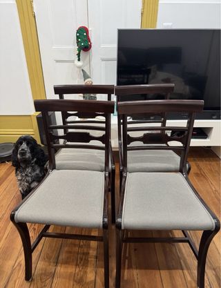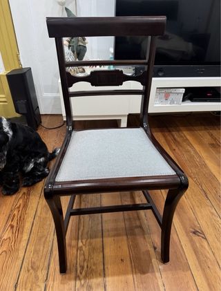 Conjunto de seis cadeiras, sendo quatro idênticas e duas diferentes. As cadeiras possuem estrutura em madeira e assentos em tecido. - Quatro cadeiras com design igual. - Duas cadeiras com design distinto. - Assentos em tecido cinza. - Estrutura em madeira marrom.