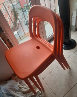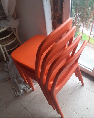 Conjunto de cadeiras de plástico empilháveis em cor laranja vibrante. São práticas e ocupam pouco espaço quando guardadas. - Design moderno e funcional. - Material resistente e fácil de limpar.