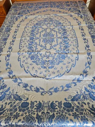 Colcha antiga da marca Damasco Livorno com um padrão floral intrincado. - Design clássico em tons de branco e azul. - Acabamento em tecido de qualidade. - Colcha antiga senhorial - É reversível - Com franja nas laterais - Nova - Mede 184X235cm