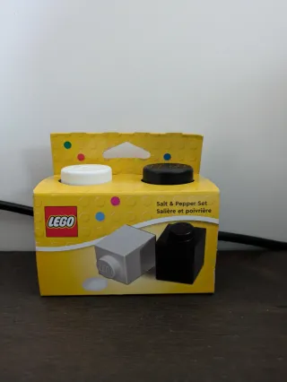 Conjunto de saleiro e pimenteiro com design inspirado em peças Lego. Perfeito para adicionar um toque divertido à sua cozinha. - Peças em plástico. - Design icônico Lego. Novo, ainda em embalagem original.