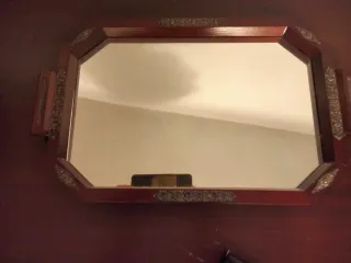 Tabuleiro decorativo em madeira com detalhes em metal. - Moldura octogonal em madeira. - Detalhes metálicos nas bordas e laterais. - Superfície espelhada. 43 x 28Cm