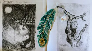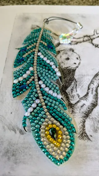 Marcador de livros em forma de pena, decorado com a técnica Diamond Painting. Finalizado com selante, que lhe confere maior brilho, limpeza e durabilidade. Em tons de verde água, azul e dourado. Com pingente em forma de gota. Completamente novo!