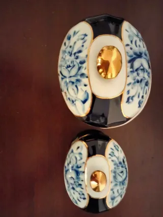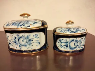 Conjunto de 2 peças em porcelana, pintadas á mão perfeitas para guardar joias ou pequenos objetos. Apresentam um design clássico com detalhes em azul e dourado. - Duas caixas com tampas. - Padrão floral em azul. - Acabamento dourado nas bordas e nos puxadores. Alt 7 cm / base 13,5 + alt 5 cm / base 9 cm ( altura sem considerar a tampa)